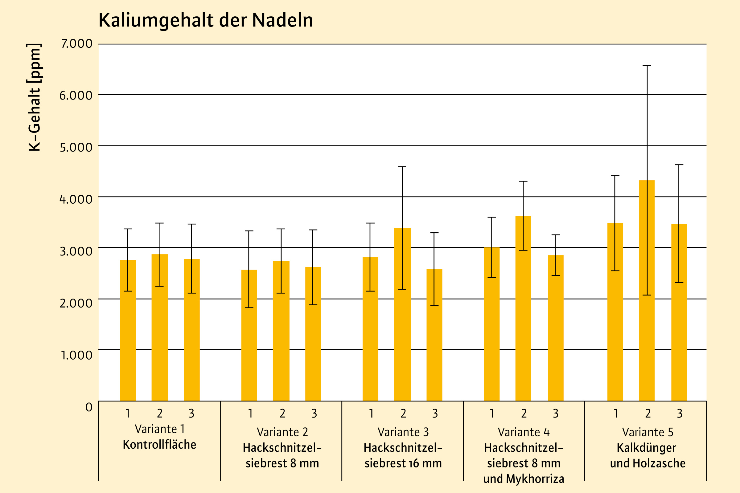 Andere Studien (bspw. Borchert et. al., 2015) zeigen, dass die Mineralisierung insbesondere bei Kalium rasch abläuft. Entsprechend lässt sich vermuten, dass ein potenzieller Effekt der Ausbringung der Hackschnitzelreststoffe bezogen auf die Kaliumgehalte am schnellsten bzw. am ehesten zu beobachten ist. Signifikante Unterschiede, unabhängig von Licht- bzw. Schattenkrone oder Nadeljahrgang, konnten bei den Kaliumgehalten zum Zeitpunkt der zweiten Beprobung bei der Ausbringung von feinem Siebrest (8 mm mit Mykorrhiza (Variante 4)) sowie von Kalkdünger (Variante 5) im Vergleich zur Kontrollfläche (Variante 1) festgestellt werden. Dieser mögliche positive Effekt der Ausbringung lässt sich allerdings bei der 3. Beprobung nicht mehr feststellen.