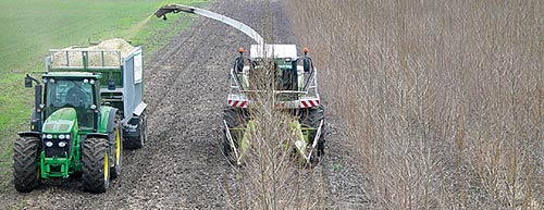 Die Ernte erfolgt mit Vollerntegeräten alle zwei bis vier Jahre, bei unterbrochener Arbeitskette alle fünf bis zehn Jahre zwischen November und Februar. Aus den verbleibenden Stöcken entwickeln sich die Ausschläge (Triebe) für die nächste Ernte.