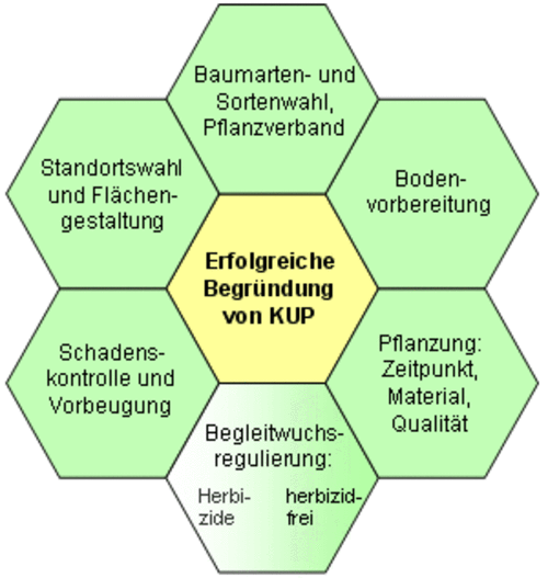 Eine erfolgreiche Begründung von KUP ist erst in der Gesamtbetrachtung der verschiedenen Einflussfaktoren möglich (Abb. 1). Eine Schlüsselrolle kommt insbesondere bei Pappelsteckhölzern der Begleitwuchsregulierung zu. Dies kann durch frühzeitige mechanische Pflegeeingriffe erfolgen. Entscheidend ist dabei vor allem die erste Vegetationshälfte nach der Pflanzung. Regelmäßige Flächenkontrollen sind notwendig. Eine weitere, zumindest für einige Anwendungsfälle viel versprechende Alternative für die herbizidfreie Begründung ergaben Versuche, bei denen die Steckhölzer in Mulchfolie gesteckt wurden. Auf den drei Versuchsflächen zeigte sich ein schnelleres Wachstum im ersten Jahr. Bei Beachtung einiger Regeln kann auf weitere Begleitwuchspflegen verzichtet werden.