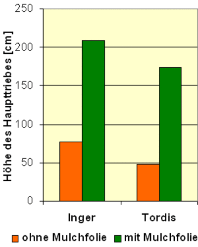 - Pflege: Behandlungsbedingte Wuchsvorteile zeigten sich vor allem bei Verwendung von Mulchfolien. So waren die durchschnittlichen Höhenwerte der in Folie gesteckten Weiden in VFL 5 nach dem ersten Jahr etwa dreimal so hoch wie die der Weiden, die ohne Schutz in eine Nutzpflanzeneinsaat gesteckt wurden (Abb. 5). Dabei wurde eine mechanische Pflege durchgeführt. Auch auf VFL 7 zeigte sich bisher ein schnelleres Wachstum der Mulchfolienvariante im Vergleich zur Herbizidvariante. Diese Wuchsvorteile liegen wohl nicht nur an der Begleitwuchsunterdrückung, sondern auch an der Verbesserung der Wachstumsbedingungen z. B. durch den Evaporationsschutz.