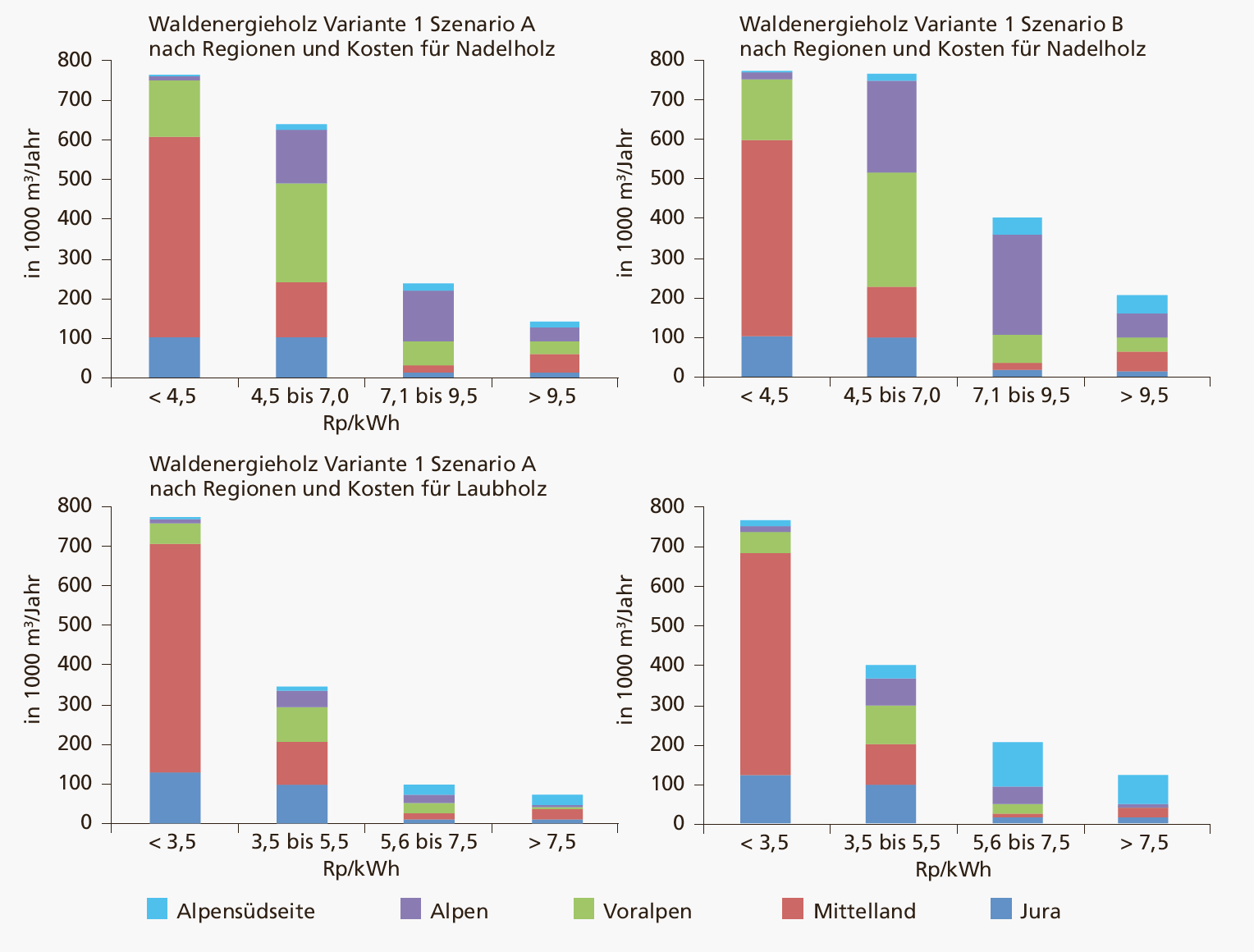 Über die Höhe des Gesamteinschlages entscheidet letztlich die Marktsituation, denn die Waldenergieholzpotenziale hängen massgeblich davon ab, ob sie wirtschaftlich genutzt werden können. Es ist daher wichtig zu wissen, welche Energieholzmengen zu welchen Kosten bereitgestellt und welche Deckungsbeiträge an die forstbetrieblichen Gesamtkosten durch das Produkt Energieholz geleistet werden können.