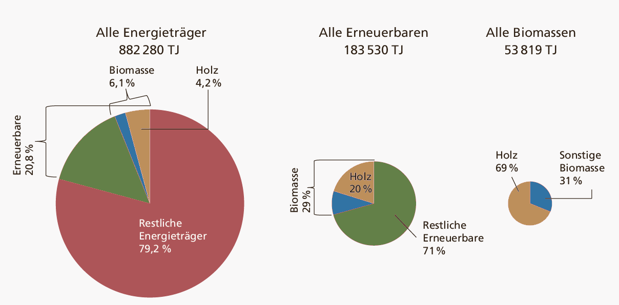 Holz spielt im Gesamtvergleich zu allen Energieträgern eine untergeordnete Rolle. Betrachtet man jedoch die Erneuerbaren für sich, so ist Holz derzeit nach der Wasserkraft die zweitwichtigste erneuerbare Energiequelle in der Schweiz. Im Kontext aller energetisch verwendeten Biomasse nimmt das Holz eine noch bedeutendere Position ein (Abb. 3). In den letzten Jahren hat die Nutzung von Holzenergie zugenommen. Holz deckt etwa vier Prozent des gesamten Schweizer Endenergieverbrauchs. Die Wärmeerzeugung macht mit 95 Prozent derzeit den grössten Anteil der energetischen Holznutzung aus.