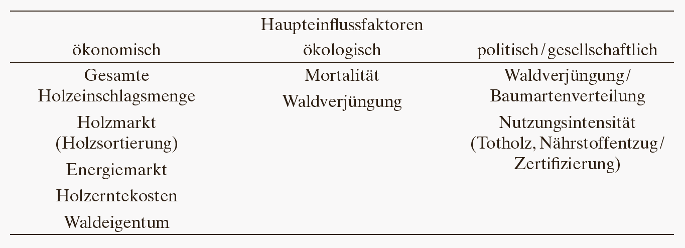 Es bestehen zahlreiche Risiken und Unsicherheiten, die dazu führen können, dass die in Abbildung 4 dargestellten Energieholzpotenziale nicht ausgeschöpft werden. Vor allem aus politischen sowie aus ökonomischen, insbesondere wettbewerbsbedingten Gründen können sie beschränkt werden. Deshalb sind namentlich die Waldenergieholzpotenziale keine starren Grössen. Sie hängen von einer Vielzahl von Faktoren ab. Dies macht es notwendig, die Haupteinflussfaktoren zu identifizieren (Tab. 1) und ihre Wirkung im Zeitablauf zu analysieren.
