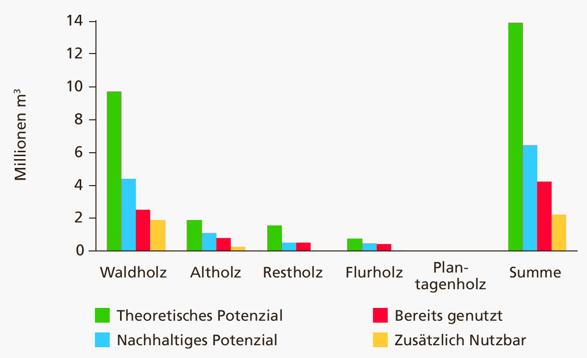 Das Waldenergieholz stellt das grösste Energieholzpotenzial dar. Der jährliche Holzzuwachs im Schweizer Wald entspricht dem theoretischen Potenzial und betrug 2011 9,7 Mio. m3. Das nachhaltige Potenzial wird als Mittelwert zweier Varianten eines nachhaltigen Nutzungsszenarios für die Jahre 2017 bis 2026 abgeschätzt und beträgt 4,4 Mio. m3/a. Das bereits genutzte Potenzial beläuft sich auf rund 2,5 Mio. m3/a (der Anteil des forststatistisch nicht erfassten energetisch genutzten Holzes wurde grob und eher hoch geschätzt). So ergibt sich eine zusätzlich nutzbare Menge von 1,9 Mio. m3/a Waldenergieholz, die als konservative Schätzung zu interpretieren ist.