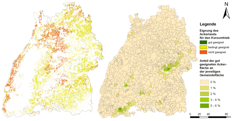 Ackerflächen mit einer Ackerzahl unter 33, einer Hangneigung unter 10 % und einer guten Wasserverfügbarkeit wurden dementsprechend als für die Kurzumtriebsbewirtschaftung gut geeignet angesehen. Das Ergebnis zeigt, dass nur ca. 0,6 % der Ackerflächen in Baden-Württemberg (5000 ha) diese Eigenschaften aufweisen. Wie die Abb. 4 zeigt, liegen diese Flächen vor allem am südlichen Schwarzwaldrand und im nördlichen Teil der Schwäbischen Alb.