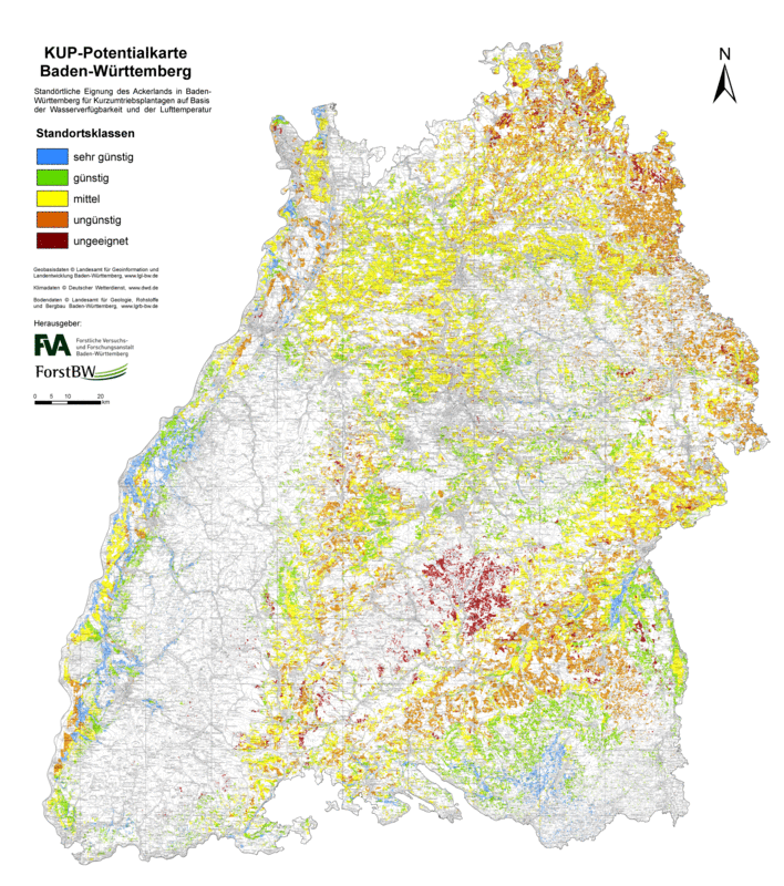 Dies liegt vor allem daran, dass ein großer Teil des Dauergrünlands im Schwarzwald und in der Voralpenregion liegt. Aufgrund der recht hohen Niederschlagsmengen in diesen Regionen ist somit eine gute Wasserverfügbarkeit für KUP gegeben. Tatsächlich ist jedoch seit der Neuregelung des Landwirtschafts- und Landeskulturgesetzes für Baden-Württemberg die Nutzung des Dauergrünlands für den Kurzumtrieb nahezu ausgeschlossen. Das KUP-Potenzial auf Dauergrünland wird deshalb im nachfolgenden nicht weiter aufgeführt. Standörtlich günstige Ackerflächen für die Anlage von KUP liegen hingegen vor allem im Oberrheingraben, wo durch Grundwasseranschluss eine gute Wasserverfügbarkeit gegeben ist sowie ebenfalls in der Voralpenregion mit hohen Niederschlägen. Würden diese für KUP standörtlich sehr günstigen und günstigen Ackerflächen mit schnellwachsenden Baumarten im Kurzumtrieb bewirtschaftet, so ließen sich damit jährlich umgerechnet knapp 2,5 Mio. tatro Energieholz produzieren. Die geographische Verteilung der standörtlichen Eignung des Ackerlands für KUP ist in Abb. 3 ersichtlich.