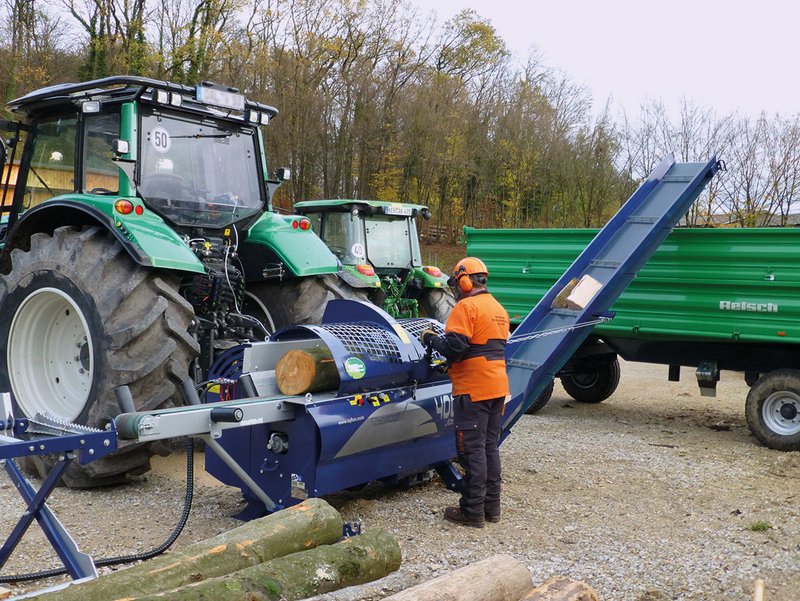 Abbildung 1: Mit Säge-Spalt-Automaten werden in einem Arbeitsschritt 5 bis 7 Raummeter pro Stunde in fertigen Ofenlängen produziert.(Foto: F. Schulmeyer, LWF).
