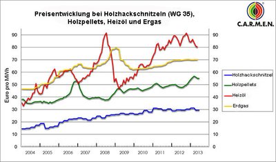 Abb. 2 - Preisentwicklung bei Holzhackschnitzeln von 2004 bis 2013. Grafik: C.A.R.M.E.N. e.V.