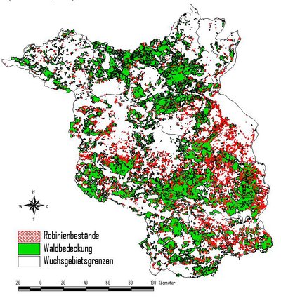 Nach Information des Bundesamtes für Naturschutz (2011) stocken in Deutschland etwa 14.000 ha Robinienbestände, wobei auf Brandenburg 8.100 ha entfallen (DSW 2009). Angesichts des prognostizierten Klimawandels dürfte diese vergleichsweise trockenresistente Baumart dort an waldbaulicher Bedeutung gewinnen. In Brandenburg kommt die Robinie im ganzen Land vor, hat den Schwerpunkt ihrer momentanen Verbreitung jedoch in den östlichen und südlichen Landesteilen (Abb. 2).