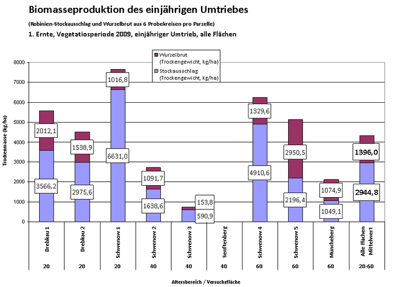 Auf den Versuchsflächen zeigte sich eine hohe Wüchsigkeit der Stockausschläge und der Wurzelbrut im ersten Jahr. Die durchschnittliche Biomasseproduktion über alle Altersstufen und -standorte beträgt 4,34 t pro ha·und Jahr. Die Erträge schwanken um den Faktor 10 zwischen 0,75 t pro ha und Jahr (Schwenow 3, Z2) und 7,65 t pro ha und Jahr (Schwenow 1, K2). Der auffällig geringe Biomasseertrag im Altersbereich 40 Jahre ist auf den besonders ertragsschwachen Standort Schwenow 3 zurückzuführen, der durch die im ersten Umtrieb noch fehlende Fläche Senftenberg deutlich stärker ins Gewicht fällt. Eine klare Alters- oder Standortabhängigkeit ist bisher nicht erkennbar (Abbildung 4).