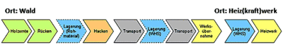 Mit den Betreibern der Biomasse(heiz)kraftwerke und den Hackschnitzelversorgern (Unternehmer, Waldbesitzer und Zusammenschlüsse) wurden Leitfadeninterviews geführt und die Struktur der aktuellen Beschaffungslogistik erfasst. Dabei wurde eine beispielhafte Prozesskette verwendet (Abb. 1). Für jeden dieser Prozessschritte wurde folgendes ermittelt: