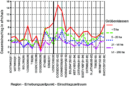 Abb. 2: Regionaler Vergleich der Studienergebnisse über den Gesamteinschlag nach Größenklassen (li. der schwarzen Begrenzungslinie: Ergebnisse aus forsttechnischen Erhebungen, re.: Ergebnisse aus sozioökonomischen Erhebungen; die Abkürzungen bedeuten Himmelsrichtungen und Bundesländer, NDD = nördl. der Donau, SDD = südl. der Donau; TI89(88) = Region + Erhebungszeitpunkt + Einschlagszeitraum; BGLD94*(82-92) = Region + Veröffentlichungsjahr + Einschlagszeitraum) Quelle: Huber (2006)