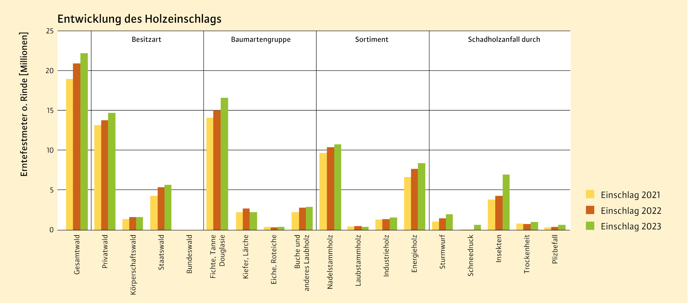 Der Gesamteinschlag lag 2023 mit 22,18 Mio. Festmetern um 6 % höher als im Vorjahr. Damit war der Einschlag das zweite Jahr in Folge deutlich über dem Niveau der vorangegangenen Jahre. Die Einschlagserhebung der Bayerischen Landesanstalt für Wald und Forstwirtschaft (LWF) ergab 2023 für Bayern eine Holzmenge von 14,71 Mio. Festmetern im Privatwald und 1,64 Mio. Festmetern im Körperschaftswald. Die Einschlagsmengen sind somit im Privatwald um 7 % gegenüber dem Vorjahr gestiegen; im Körperschaftswald sind sie in etwa gleichgeblieben. Aus dem Staatswald (mit Nationalparken) wurde eine Einschlagsmenge von 5,67 Mio. Festmetern gemeldet. Der Holzanfall war damit dort um 5 % höher als 2022. Im Bundeswald wurden etwa 152.800 Festmeter genutzt, was einer Zunahme von 69 % entspricht. In Abbildung 1 ist die eingeschlagene Holzmenge der vergangenen drei Jahre nach Waldbesitzarten, Baumartengruppen und Sortimenten dargestellt, jeweils bezogen auf den Gesamteinschlag in Bayern.