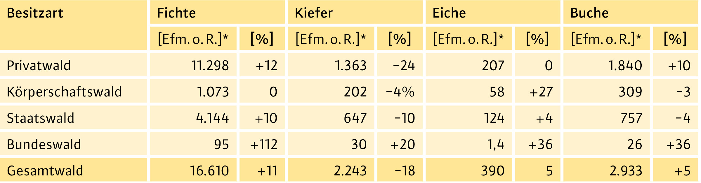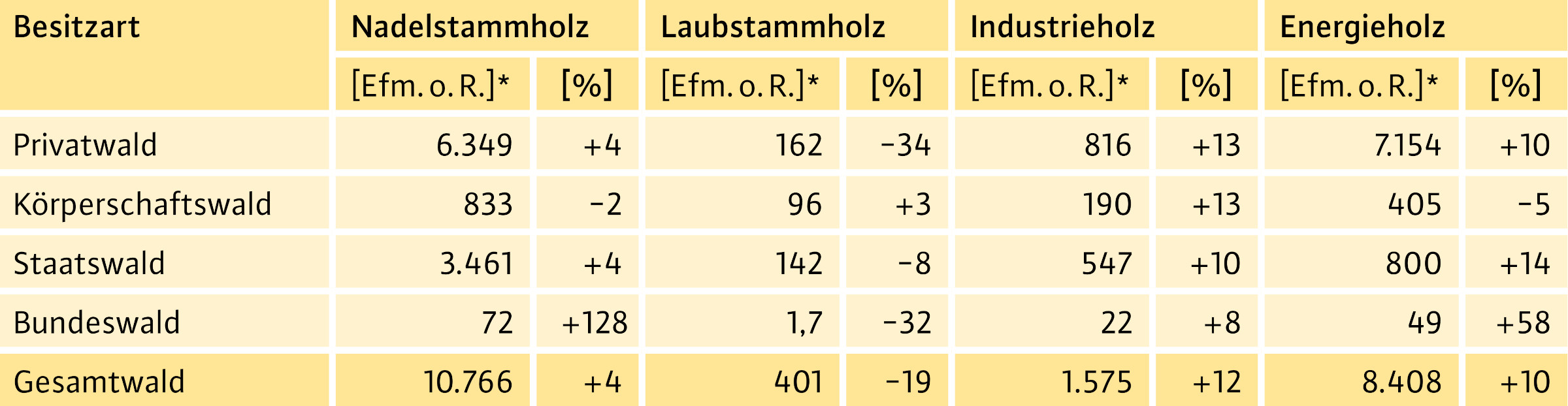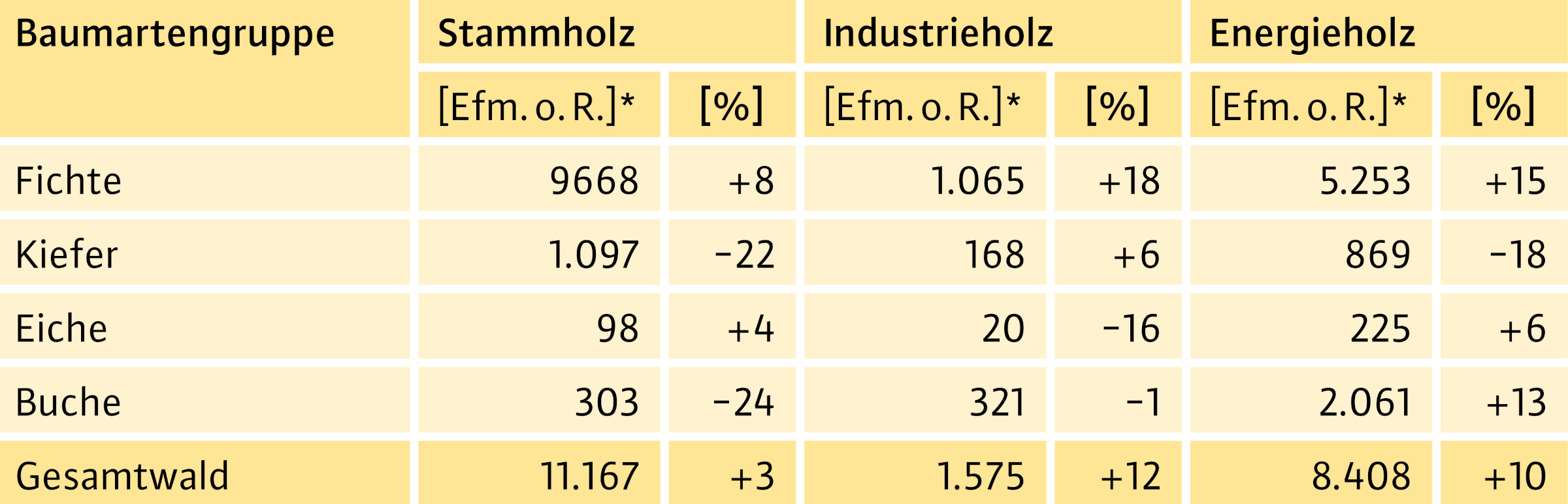 Innerhalb dieser Gruppierungen wird die Holzmenge in Erntefestmetern ohne Rinde (Efm. o. R.) für Stamm-, Industrie- und Energieholz (Scheitholz und Hackschnitzel) erhoben.