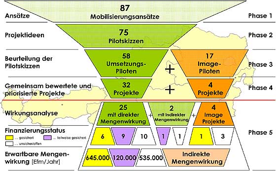 Nach Abgleich und Bewertung der Pilotskizzen ergaben sich 27 Umsetzungsprojekte mit einer erwartbaren, direkten oder indirekten Mengenwirkung sowie vier Imageprojekte, die Österreich weit in Umsetzung gebracht werden könnten. Die zu erwartende Mengenwirkung läge bei rund 1,3 Mio. Efm/Jahr. Die Sortimentsverteilung liegt bei 80% Nutzholzsortimenten (Sägerundholz 61%, Industrieholz und Plattenholz 19%) sowie 20% Energieholz.