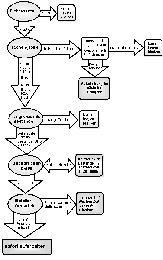 - Insbesondere die Lebendlagerung von Fichte ist abhängig von der Forstschutzsituation der Umgebung, deshalb sind kontinuierliche Käferkontrollen unerlässlich (siehe Entscheidungshilfe unten).