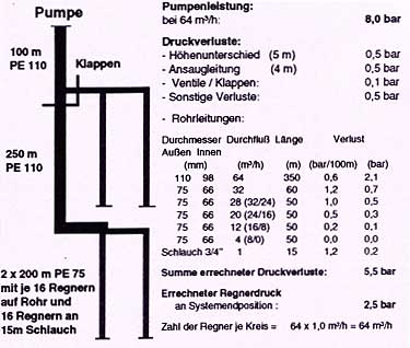 | Zuleitung zur Beregnungsanlage | Metall, PE oder Feuerwehrschläuche, Ø 8 bis 12 cm |