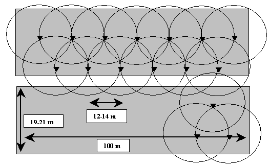 - Die Holzpolter müssen von den Regnern vollständig erfasst werden (Oberfläche, Stirnflächen, Polterflanken, Windabdrift beachten!). Eine Überdeckung der Regnerkreise (Dreiecksverband) gewährleistet eine optimale Abdeckung (zwei Reihen je Querpolter, Regnerabstand in der Reihe von 12 - 14 m).
