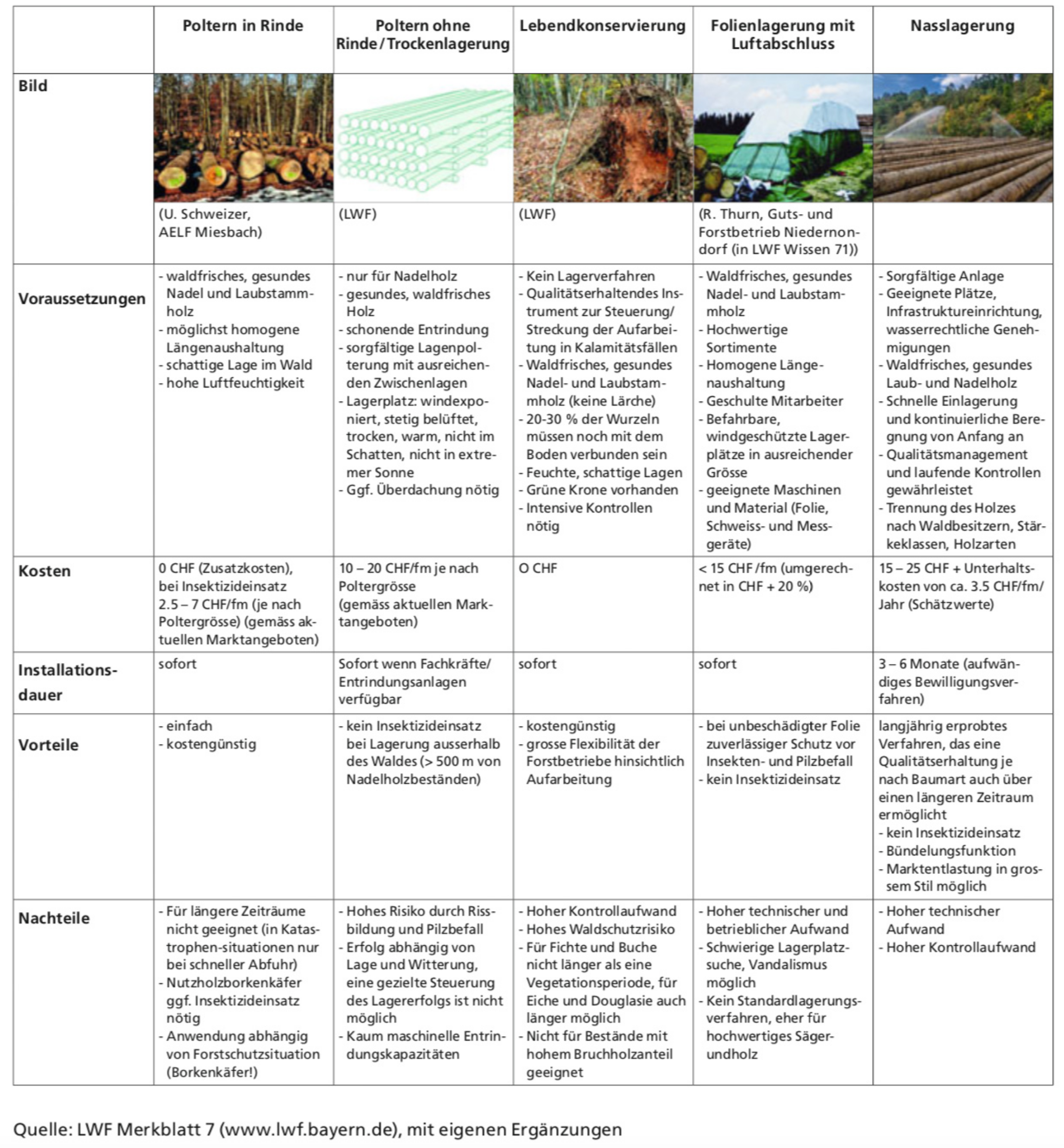 Das Holz kann entweder trocken oder nass gelagert werden. Die Bayerische Landesanstalt für Wald und Forstwirtschaft (LWF) hat in einem Merkblatt die gängigen Verfahren gegenübergestellt.
