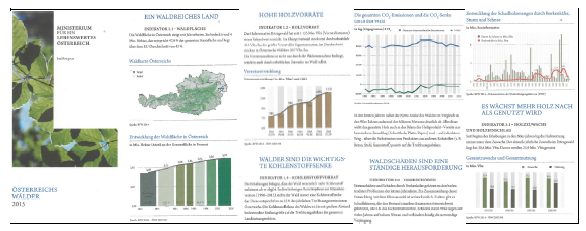 Auf Grund der hohen Anzahl von Indikatoren fokussierte die Indikatoren-Arbeitsgruppe im Jahr 2014 auf die Identifizierung von 15 sogenannten Headline-Indikatoren. Diese werden anschaulich in einem doppelseitigen Faltblatt präsentiert (Abbildung 1), welches dem Waldbericht 2015 (BMLFUW, 2015) beigelegt wurde. Die Information zu den Headline-Indikatoren gibt es auch in Englisch.