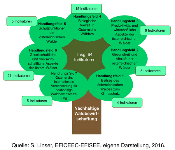 Für die Berichterstattung über den Zustand und die Trends innerhalb des Forstsektors sind die Indikatoren sieben Handlungsfeldern zugeordnet (Abbildung 2). Die Handlungsfelder 1 bis 6 entsprechen den pan-europäischen Kriterien nachhaltiger Waldbewirtschaftung des FOREST EUROPE Prozesses . Das Handlungsfeld 7 ist von zusätzlicher Relevanz für Österreich.