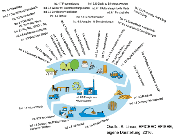 Darauf Bezug nehmend wurden 2014-2015 die pan-europäischen Indikatoren für nachhaltige Waldbewirtschaftung im FOREST EUROPE-Prozess überarbeitet. Außerdem wurden die 2011 im FOREST EUROPE-Prozess vereinbarten 2020-Ziele für Wälder sowie die Ziele für europäische Wälder durch Indikatoren operationalisierbar gemacht und ihre Umsetzung in einem Bericht (Linser & Wolfslehner, 2015) bewertet.