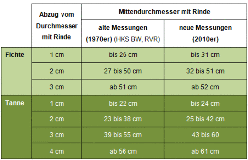 Eine Anwendung der neuen Klassengrenzen würde in Baden-Württemberg bei ähnlicher Einschlagsintensität und ähnlichen Sortimenten wie in den letzten fünf Jahren eine Erhöhung des Verkaufsvolumens von im Wald vermessenem Fichten-Stammholz um ca. 1,5% und von Tannen-Stammholz um 0,8% bedeuten.