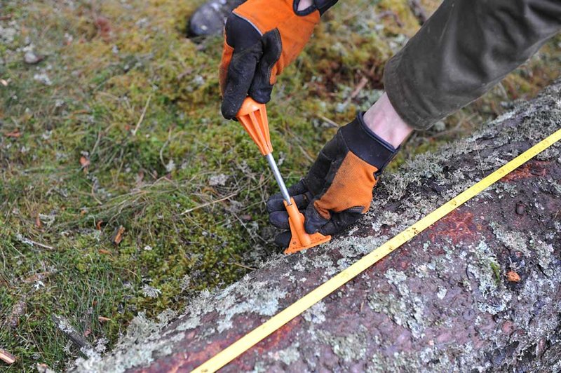 Abb. 1: Bestimmung der Rindenstärke an einem Fichtenstamm.
