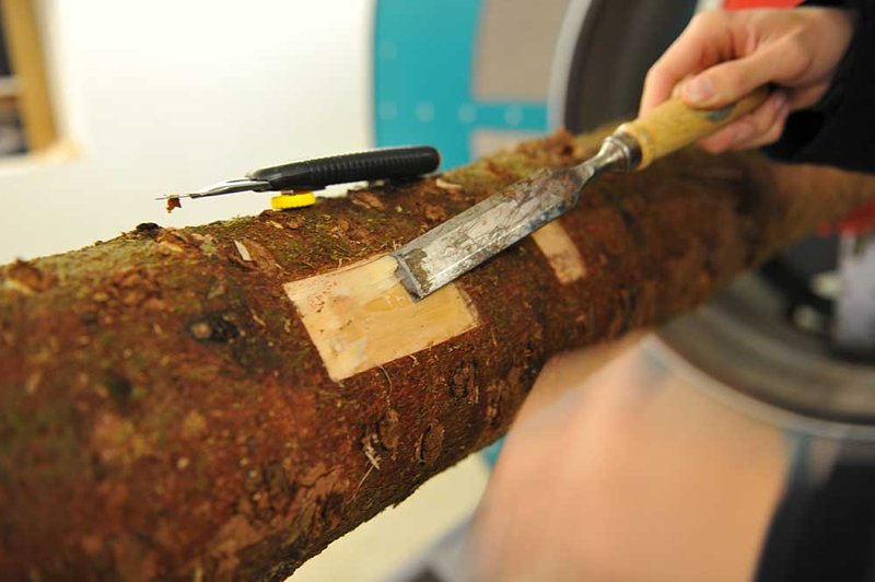 Abb. 2: Präparation eines Fichtenstamms zur Validierung der automatisierten Rindenerkennung mittels Computertomographie.