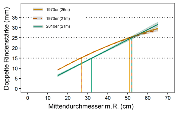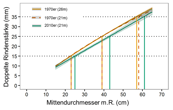 Die Ergebnisse zeigen, dass die Lage der Durchmesser im Stamm im Rahmen der simulierten Varianten (z.B. Langholz von 21 m Länge und Stammabschnitte von 5 m Länge) nur eine geringe Rolle spielt. Dies hat zur Folge, dass dieselbe Rindenabzugsfunktion sowohl für die manuelle Stammholzvermessung als auch die Vollerntervermessung angewandt werden könnte. Die Ergebnisse dieser Studie zeigen heute bei gleichem Stammdurchmesser eine geringere Rindenstärke als vor rund 40 Jahren, was eine Verschiebung der Klassengrenzen für zentimeterweise Rindenabzüge zur Folge hat (Tabelle 1).
