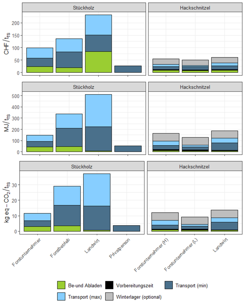 Bei der Transportkette "Stückholz/Forstunternehmer“ durchschnittlich 10 bis 20 km vom Werkhof bis zur Waldstrasse, wo er das gepolterte, kranlange Rundholz mit einem für Rundholz geeigneten LKW mit Kran lädt. Zurück im Werkhof wird dann das Rundholz verarbeitet, bevor es über eine durchschnittliche Entfernung von 5 bis 10 km mit einem Personenwagen mit Anhänger als Stückholz von 33 cm Länge an den Endverbraucher ausgeliefert wird. Die durchschnittliche Liefermenge beträgt drei Ster. Im Gegensatz dazu fährt ein Schweizer Landwirt mit seinem Traktor mit Anhänger über eine durchschnittliche Entfernung von 1 bis 10 km vom Hof bis zur Waldstrasse. Das Holz wird vor Ort aufbereitet und das Beladen erfolgt manuell. Es wird anschliessend über eine Entfernung von 5 bis 10 km direkt an den Verbraucher ausgeliefert.