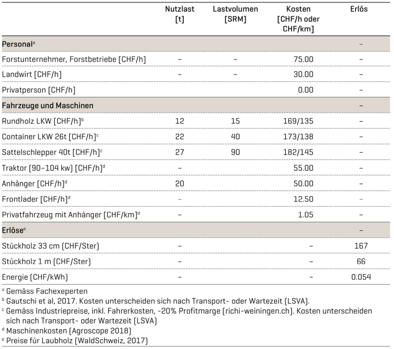 Tab. 1. Eingangsparameter für die Berechnung der Transportkosten und Erlöse. Quelle: WSL
