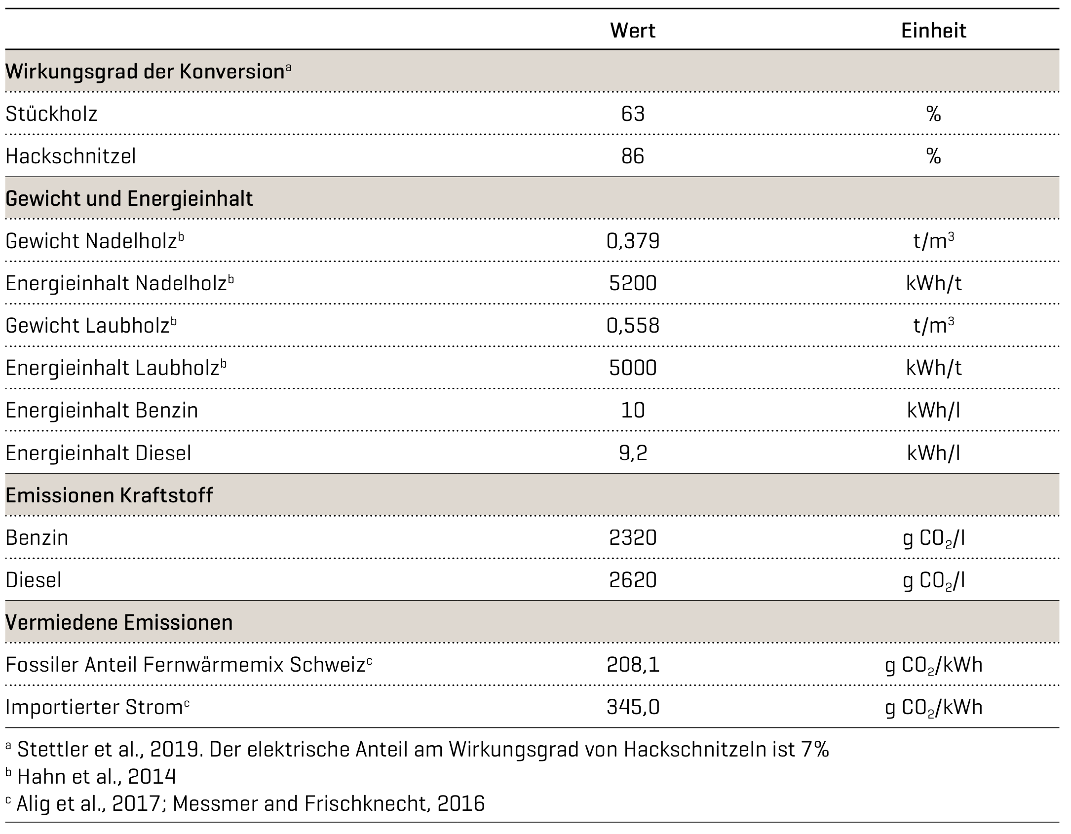 Tab. 2. Eingangsdaten für die Berechnung von Energieverbräuchen und CO2-Emissionen. Quelle: WSL