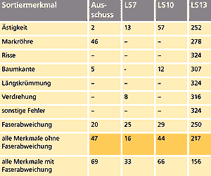 Faserabweichung: Eine Berücksichtigung der Faserabweichung würde viele Prüfkörper abwerten. Die Ausbeute insbesondere in der besten Sortierklasse LS13 sinkt erheblich (Tab. 1).