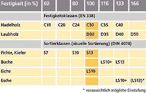 Die Ergebnisse zeigen, dass visuell sortiertes Eschenholz der beiden Sortierklassen der Festigkeitsklasse D40 zugeordnet werden kann (Tab. 2). Vermutlich kann das Holz der Sortierklasse LS13 sogar die Festigkeitsklasse D50 erreichen. Dahingehend wären aber noch weitere Untersuchungen notwendig. Insgesamt weist Eschenholz eine um 33 Prozent höhere Festigkeit als visuell sortiertes Schnittholz von Fichte und Kiefer in der höchsten Sortierklasse S13 auf. Im Vergleich mit Buchenholz liegen die Werte auf gleichem bzw. sogar auf höherem Niveau (Tab. 2).