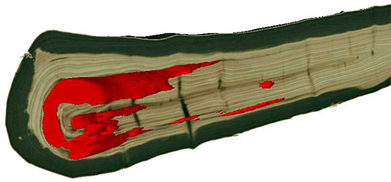 Abb 4: Längs aufgeschnittener virtueller Stamm mit dunkel eingefärbtem Splintholz und rot eingefärbter automatisch erkannter Fäule.