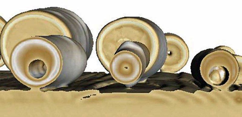 Abb 8: 3-D-Rekonstruktion von Ästen: mit leerem Insektenfraßgang (links) und mit Larve in Fraßgang (rechts).