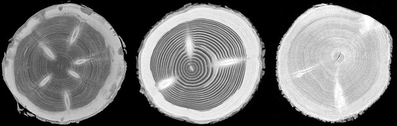 Abb 2: Querschnitte von Fichte, Douglasie und Eiche im Vergleich.