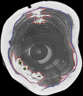 Abb 5: Querschnitt von Fichte; rot umrandet Fäule im Anfangsstadium, gelb umrandet fortgeschrittene Fäule.