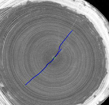 Abb 6: Automatisierte Risserkennung (blau) bei Fichte.