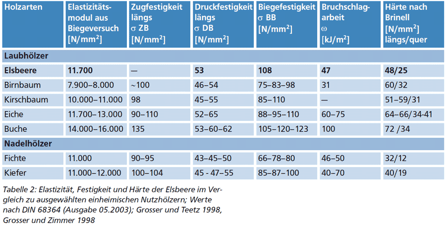 Das Holz der Elsbeere ist hart, dicht und sehr feinfaserig. Mit einer mittleren Rohdichte (rN) von 0,70 bis 0,75 g/cm3 liefert sie ein schweres Holz (Tab. 1). Die guten Elastizitäts- und Festigkeitseigenschaften entsprechen denen der Eiche (Tab. 2). Elsbeerholz ist sehr zäh, von großer Spaltfestigkeit und wird als ziemlich biegsam beschrieben.