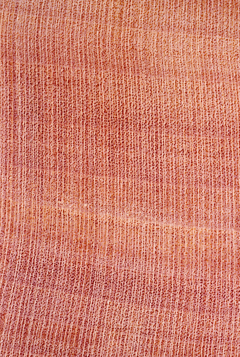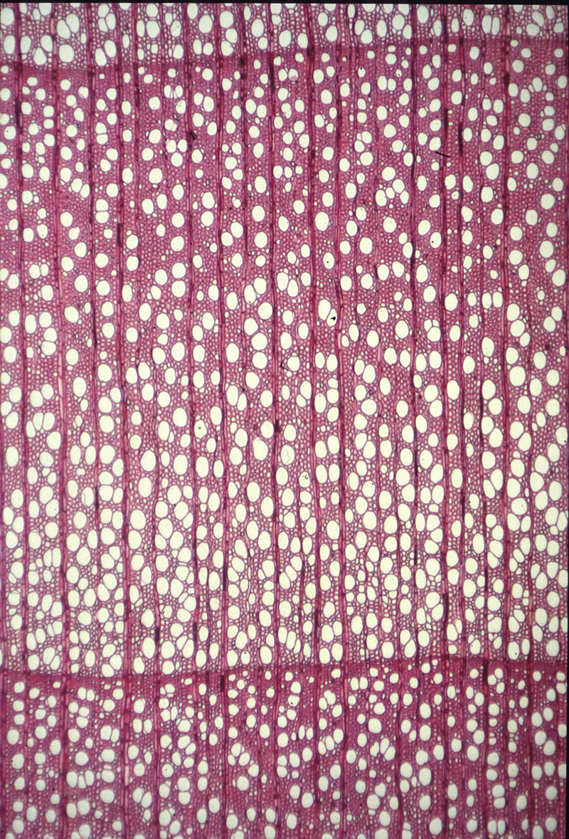 Die zahlreichen Gefäße stehen einzeln und sind typisch zerstreutporig angeordnet. Mit zunehmender Jahrringbreite ist eine Tendenz zu einer schwachen Halbringporigkeit zu erkennen. Die Gefäße sind ausgesprochen fein und somit erst unter der Lupe erkennbar (Mikrobild Abb. 6 und Lupenbild Abb. 7). Der Feinporigkeit entsprechend sind die Längsflächen kaum nadelrissig. Ebenfalls mit bloßem Auge kaum erkennbar sind die Holzstrahlen. Sie sind lediglich auf sauber abgezogenen Hirnflächen als dicht gestellte, feine Linienzüge deutlich (Abb. 7). Die Jahrringe treten aufgrund eines etwas dichteren letzten Spätholzes etwas prägnanter hervor. Dadurch ergibt sich auf den Tangentialflächen eine unauffällige feine Fladerzeichnung (Abb. 3). Gehobelte Flächen sind fast glanzlos, ein besonderer Geruch fehlt.