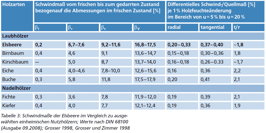Mit einem Volumenschwindmaß von 16,8 bis 17,5 % schwindet Elsbeere recht stark und neigt beim Trocknen stark zum Reißen und Verwerfen (Tab. 3). Nach dem Trocknen reißt und verwirft das Holz kaum noch, nimmt nur langsam wieder Feuchte auf und zeichnet sich daher durch ein hohes Stehvermögen aus.