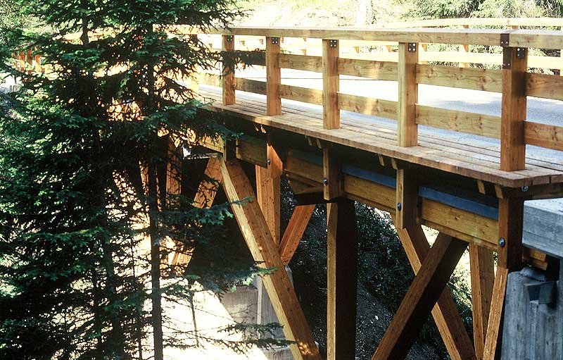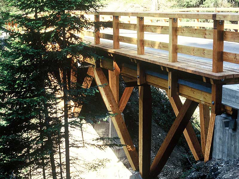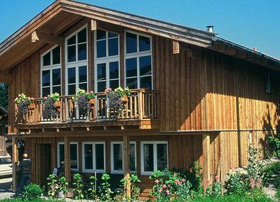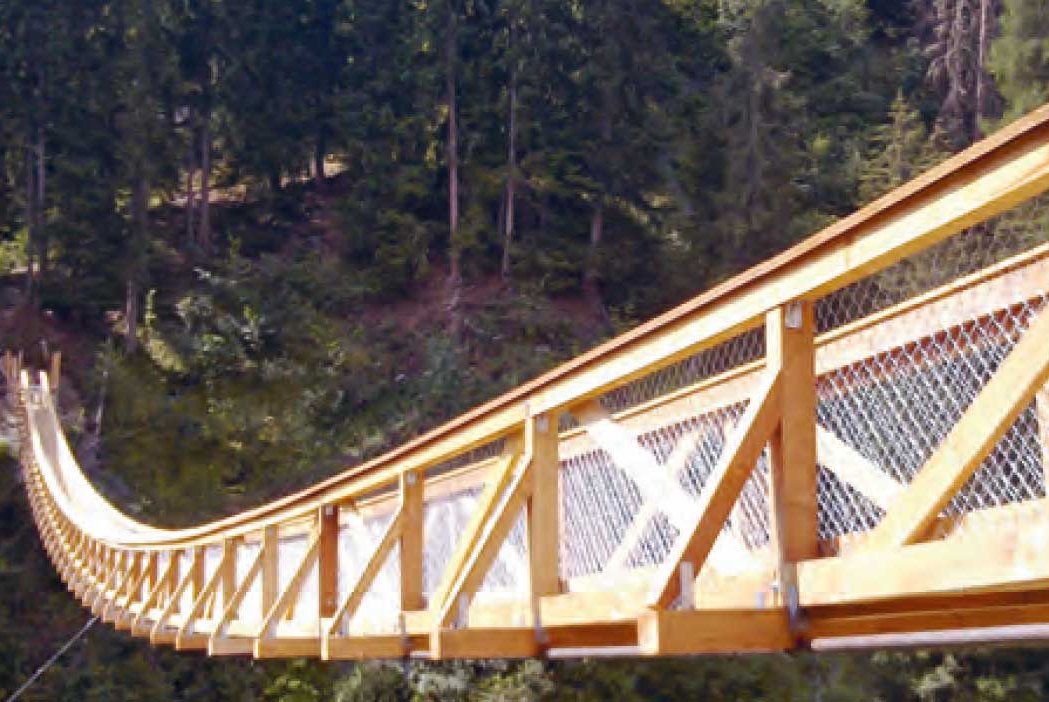 Als Bau- und Konstruktionsholz bietet sich die Lärche vor allem für hochbeanspruchte Konstruktionen an – außen für den Erd-, Brücken-, und Wasserbau (Abb. 5), innen für Dachtragwerke, Wand- und Deckenkonstruktionen. Im Hausbau ist Lärche im Außenbereich für Rahmenkonstruktionen, Fassadenelemente, Brüstungen, flächendeckende Bekleidungen von Wänden, Balkone, Dachüberstände, Giebel, Haustüren, Garagentore und Fenster vorteilhaft verwendbar (Abb. 6 bis 8). Darüber hinaus gehört Lärche zu den bevorzugten Holzarten für die Herstellung von Dachschindeln (Abb. 9).