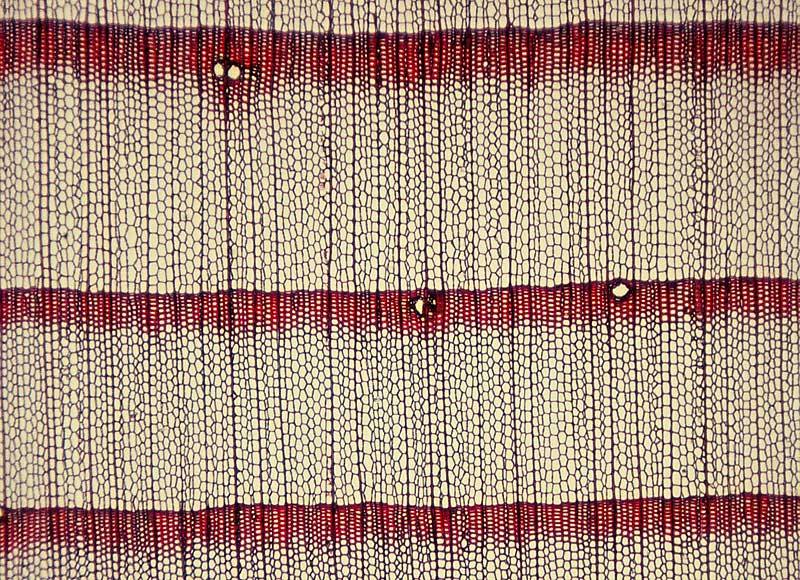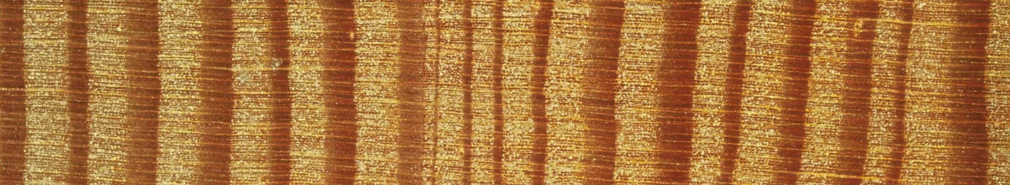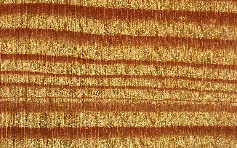Das dunkle bis tiefbraune Spätholz ist sowohl an der Jahrringgrenze als auch innerhalb der Jahrringe – also beidseitig – scharf vom Frühholz abgegrenzt (Abb. 3 und 4). Dieser abrupte Übergang innerhalb der Jahrringe ist ein weiteres kennzeichnendes Merkmal des Lärchenholzes. Der ausgeprägte Farbunterschied zwischen Früh- und Spätholz bewirkt auf den Längsflächen eine ausdrucksvolle Fladerung (Tangentialschnitt, Abb. 2) bzw. Streifung (Radialschnitt).