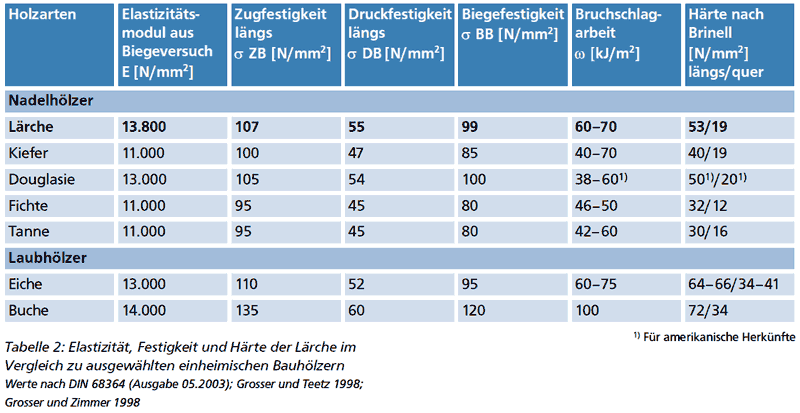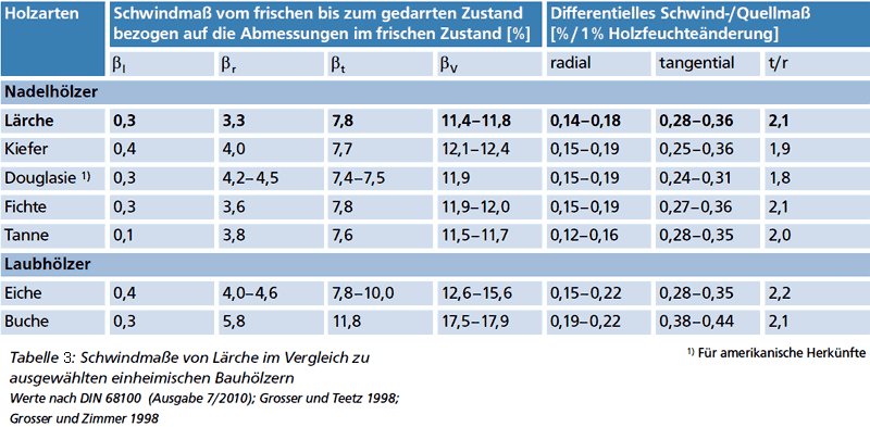 Entsprechend der hohen Rohdichte besitzt die Lärche ausgesprochen gute Elastizitäts- und Festigkeitswerte (Tab. 2). Zudem ist Lärchenholz von hoher Zähigkeit. Bei einem durchschnittlichen Volumenschwindmaß von 11,4-11,8 % gehört die Lärche zu den nur mäßig schwindenden Holzarten (Tab. 3). Nach der Trocknung zeigt Lärche bei geradfaserigem Wuchs und nicht zu breiten Jahrringen ein gutes bis befriedigendes Stehvermögen. Allerdings neigt die Lärche zu Drehwuchs. Lärchenholz bedarf einer sorgfältigen Trocknung, da es zu End- und Seitenrissen und zum Verwerfen neigt. Unter natürlichen Verhältnissen trocknet Lärchenholz verhältnismäßig langsam ab, die Trocknungszeit ist länger als bei anderen Nadelhölzern.