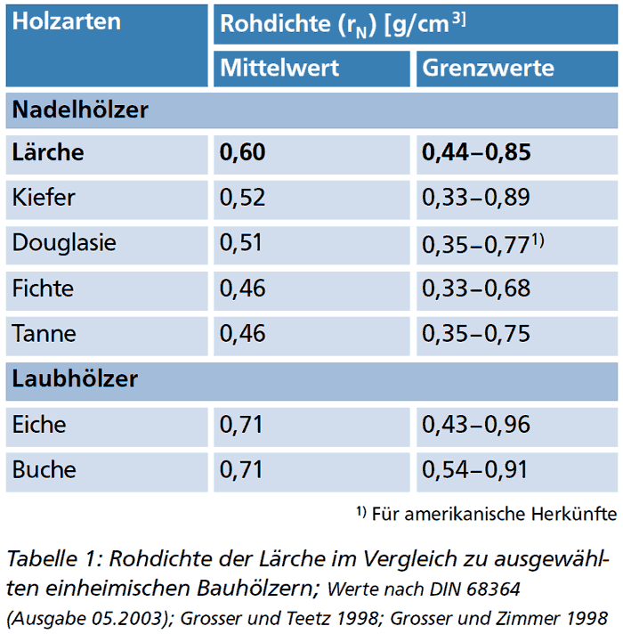 Mit einer mittleren Rohdichte von 0,60 g/cm3 bei 12-15 % Holzfeuchte liefert die Lärche das schwerste und zugleich härteste Holz unter den einheimischen Nadelhölzern (Tab. 1). Lediglich die Eibe ist noch schwerer. Das Gewicht variiert jedoch abhängig von Standort und Wuchsbedingungen erheblich. Das schwerste Holz wird bei Jahrringen zwischen einem und zwei Millimetern gebildet. In diesem Breitenbereich ist nämlich der prozentuale Anteil an dickwandigem Spätholz am größten. Bei Jahrringbreiten über zwei Millimeter bzw. unter einem Millimeter nehmen die prozentualen Spätholzanteile und damit die Rohdichte ab.