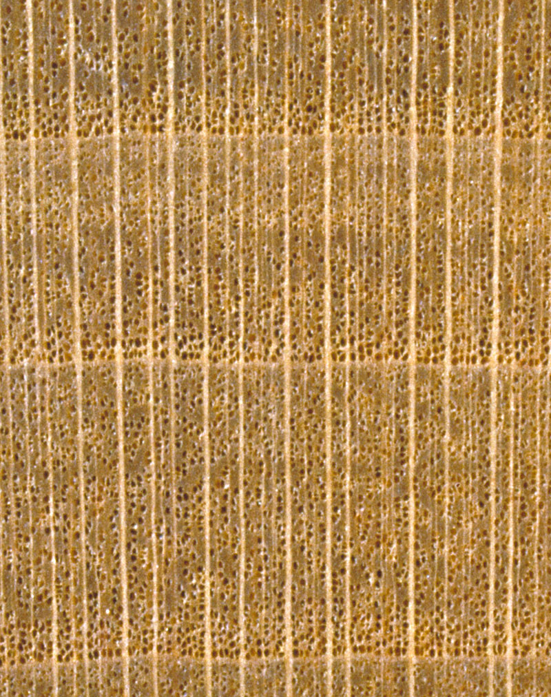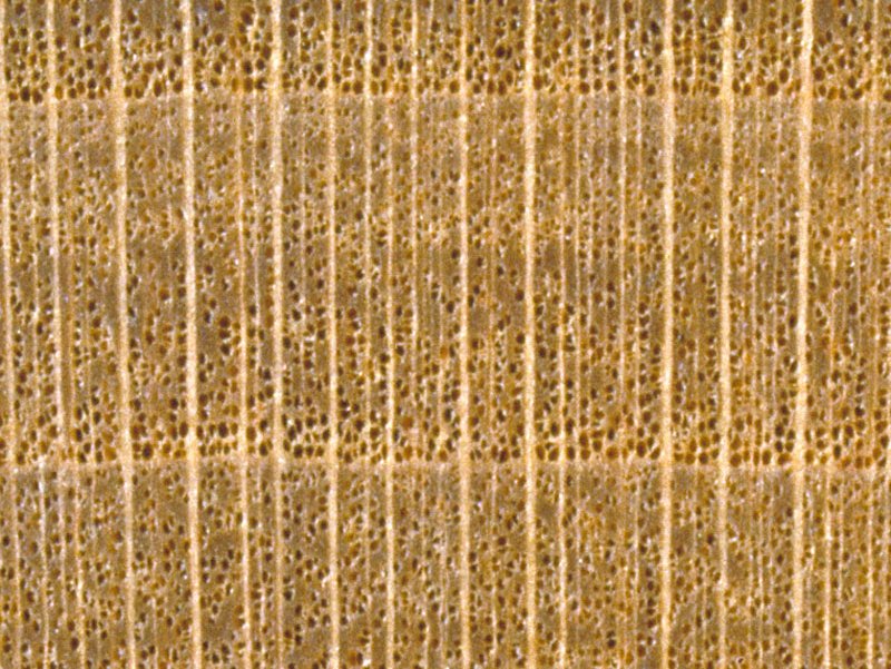 Die Gefäße im Frühholz bilden einen fast geschlossenen Porenring (Abb. 1). Die Spätholzgefäße verteilen sich dagegen locker im Grundgewebe. Damit gehört die Kirsche zu den halbringporigen Hölzern. Die Jahrringe sind zueinander klar abgegrenzt, was die Fladern oder Streifen auf der Längsfläche verursacht (Abb. 2). Zudem hat das Holz dichtgestellte aber gleichmäßige Holzstrahlen (Abb. 3). Als Besonderheit können noch dunkle feine Linienzüge das Holzbild beeinflussen. Das Holz hat von sich aus keinen charakteristischen Geruch.