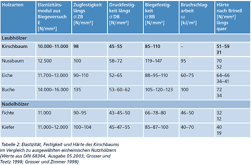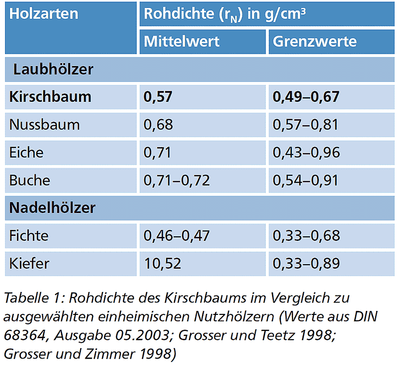Das Holz der Kirsche kann aufgrund seiner Rohdichte als mittelschwer bezeichnet werden (Tab. 1). Es bringt gute Festigkeits- und Elastizitätseigenschaften mit (Tab. 2). Im Innenbereich lässt es sich uneingeschränkt verwenden, für den Außenbereich ist es dagegen nicht geeignet.