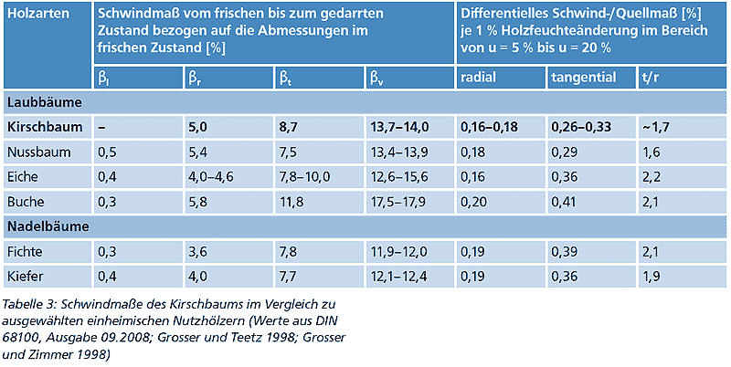 Zu schnelles Trocknen des Holzes kann zu Verwerfungen und Bildung stärkerer Endrisse führen. Nach der Trocknung weist das Kirschbaumholz in der Regel ein gutes Stehvermögen auf (Tab. 3). Es ist im Allgemeinen problemfrei zu bearbeiten. Erschwert ist lediglich das Spalten des Holzes. Aufgrund der feinporigen Struktur lassen sich problemlos geschlossene Oberflächen herstellen. Beim Kontakt mit Eisen und Wasser können leichte Verfärbungen auftreten.